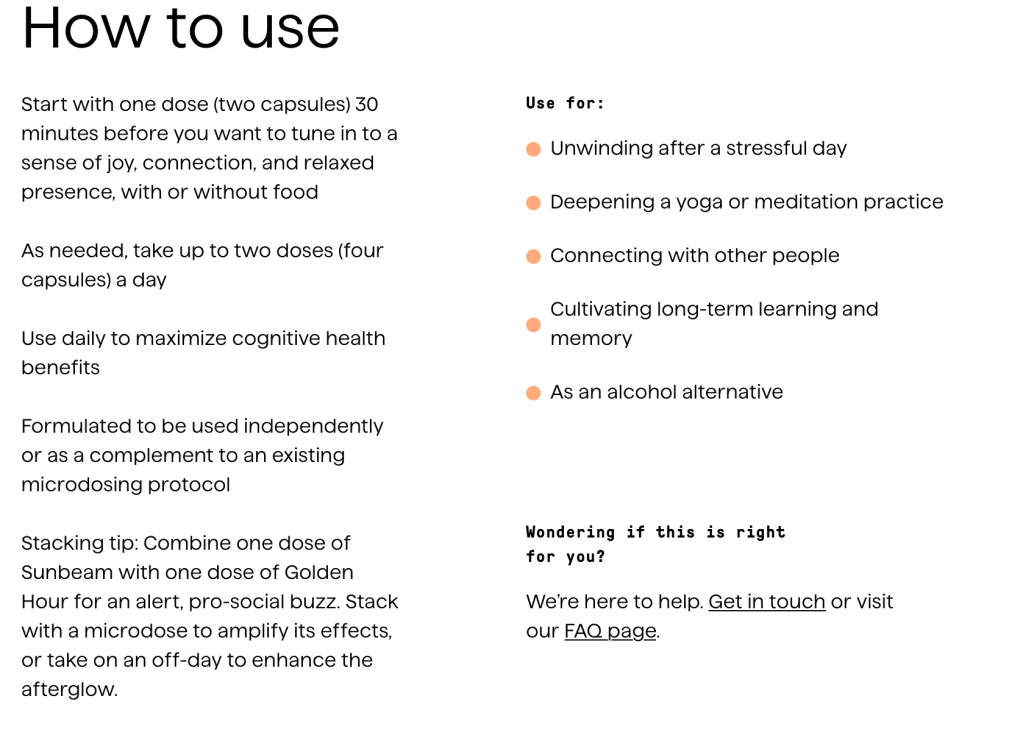 Okay, two to four capsules a day. I can handle that. Oooh and you can stack it with a microdose or a…Sunbeam? I know that’s obviously another pill they’re shilling but it did make me wonder what kind of hippie bullshit this is that assumes I have time to just curl up in a sunbeam. I’m stressed! Wait, “alcohol alternative?” That’ll shut my wife up alleviate my loving partner’s concerns.
